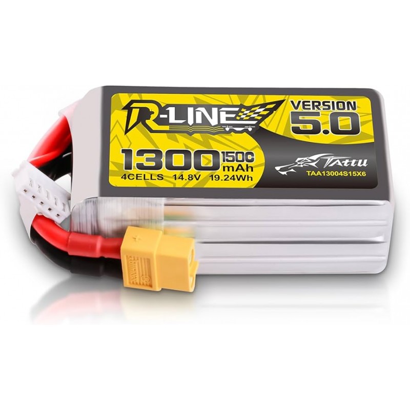 La batterie LiPo Tattu R-Line Version 5.0 1300mAh 14.8V 150C 4S1P est la version mise à jour de la série R-Line en 2022. Avec plus de puissance, une résistance interne plus faible et un poids réduit, la Tattu R-line V4 dominera assurément toutes vos courses.