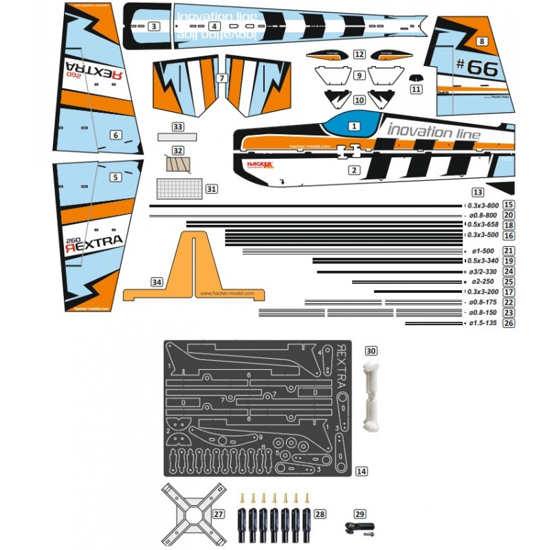 La combinaison des dimensions et des proportions parfaitement ajustées de toutes les surfaces et d'un renforcement en carbone optimisé assure une rigidité parfaite de l'ensemble de la structure du modèle, ce qui contribue au comportement prévisible et au contrôle précis du REXTRA 260 dans les manœuvres acrobatiques extrêmes.