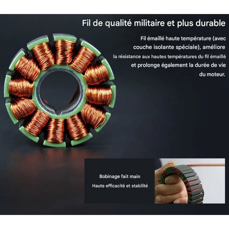 Fil émaillé haute température (avec couche isolante spéciale) améliorant sa résistance aux hautes températures et prolongeant la durée de vie du moteur. Bobinage manuel pour une efficacité et une stabilité optimales.
