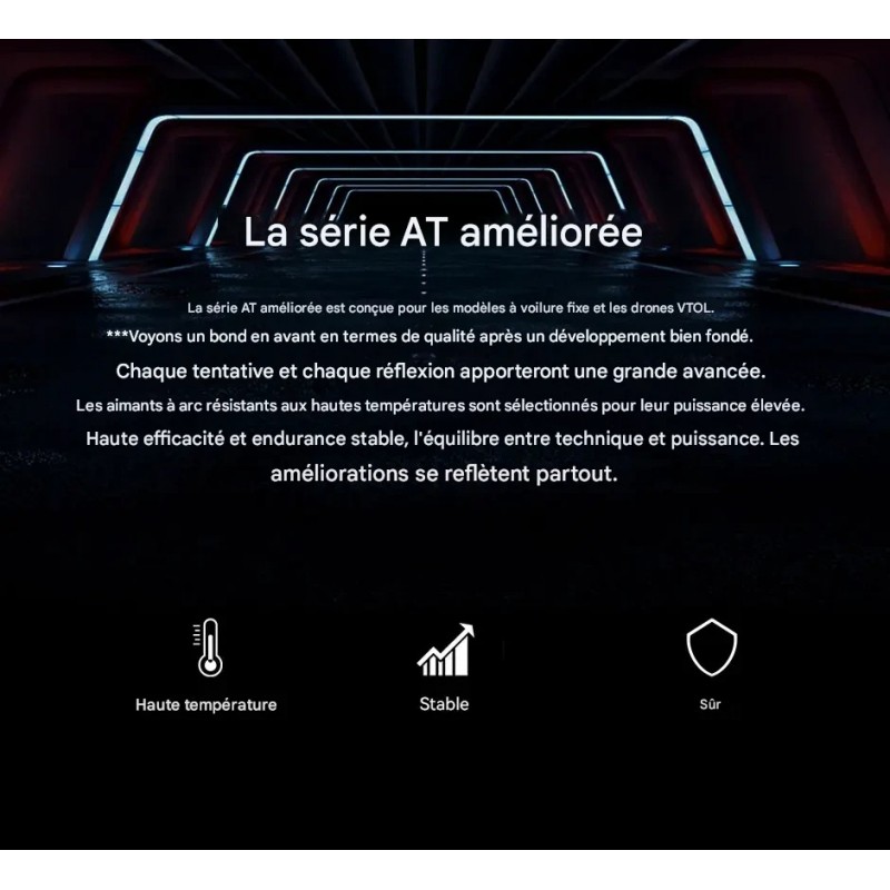 Aimants à arc magnétiques résistants aux hautes températures avec entre fer équilibré et contrôle précis des tolérances. Optimisation du circuit moteur pour augmenter les performances de plus de 5 % (sauf la série 23xx) et fournir un couple élevé à l'hélice.