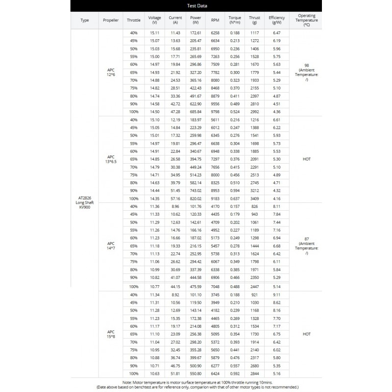 Il peut prendre en charge un accu LiPo 3 à 4S d'une puissance maximale de 1100W. Recommandé avec l'hélice T-Hobby T 13x6.5" et le contrôleur T-Hobby AT75A.