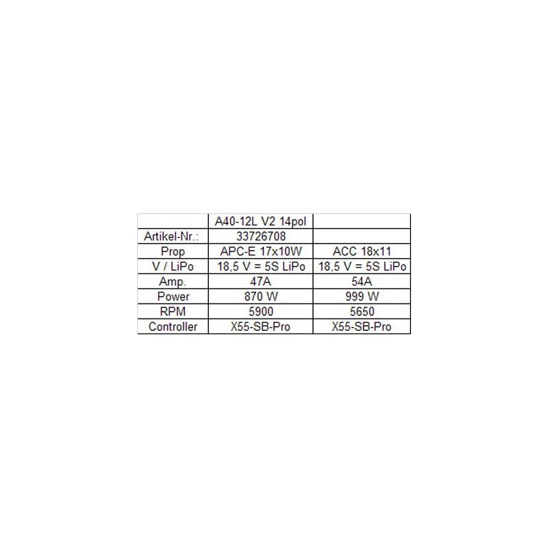 Moteur brushless Hacker A40-12L V4 14-Pole 410Kv 272grs + de détailsRéférence 124-33726615 |