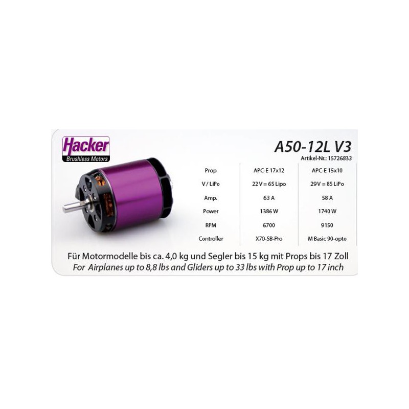 | Moteur brushless Hacker A50-12L V4 14 Poles 355Kv 445grs+ de détails Référence 124-15726840 |   |