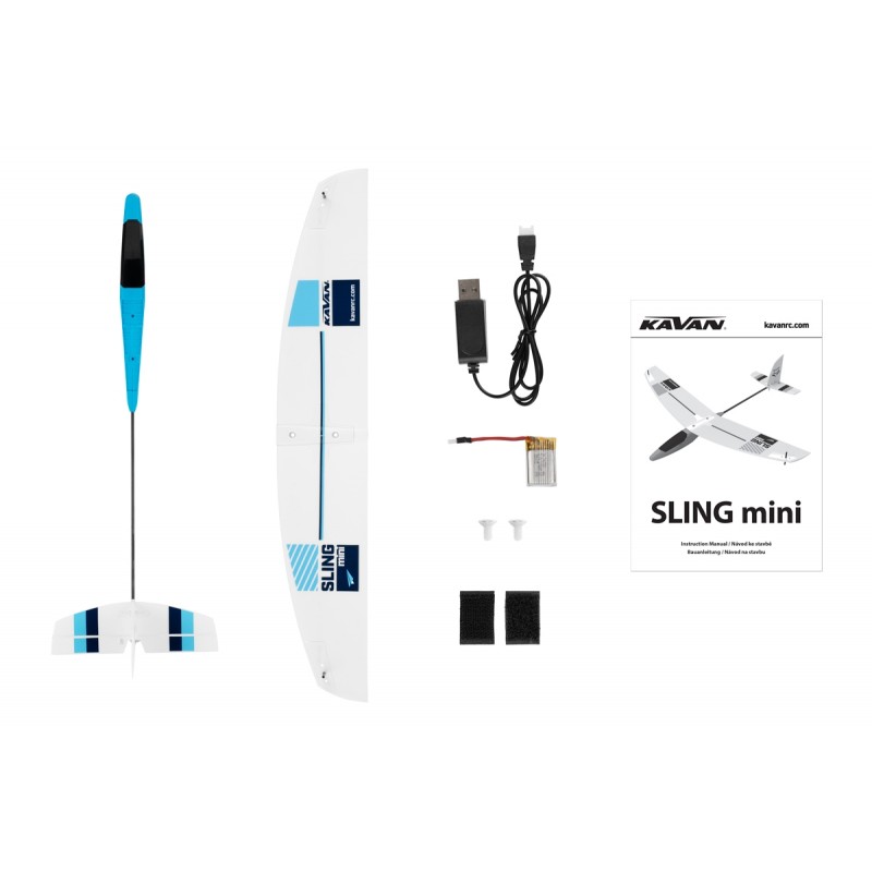 SLING mini prêt à voler, 1 accu LiPo RX, 1 chargeur USB et la notice.