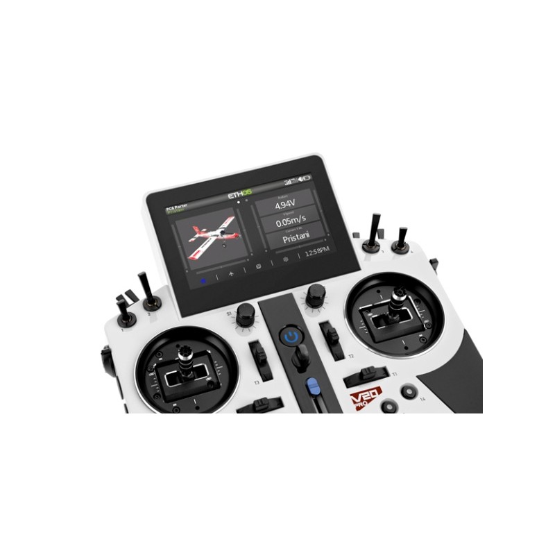 Le grand écran tactile LCD conserve une résolution de 800 × 480 pixels et une diagonale de 4,3 pouces. Cependant, le rétroéclairage a été remplacé, ce qui améliore la luminosité de l'écran, même en plein soleil. Vous distinguerez avec précision chaque nuance de couleur et chaque détail du système d'exploitation ETHOS, déjà très clair. Les utilisateurs les plus exigeants pourront personnaliser leur environnement radio grâce à des scripts Lua. Ces derniers permettent de créer des widgets personnalisés pour afficher directement sur l'écran d'accueil diverses données aéronautiques.