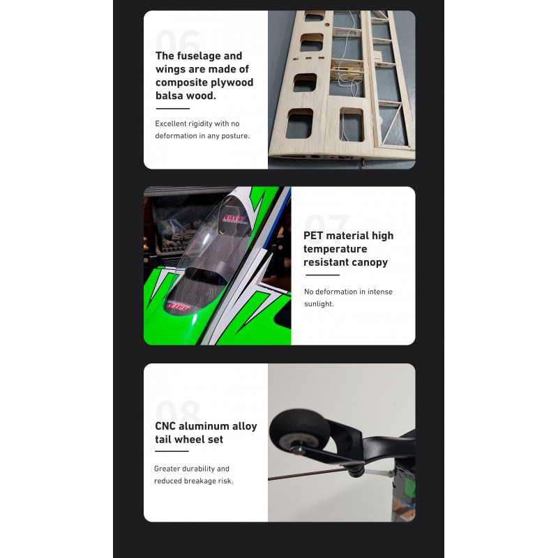 Le fuselage est de conception classique avec des pièces renforcées en contreplaqué Kevlar/carbone, un capot détachable en fibre de verre et une grande trappe fuselage/verrière permettant un accès parfait à l'ensemble du système d'alimentation. Le moteur doit être monté sur un carter/composé renforcé à l'aide d'un support radial.