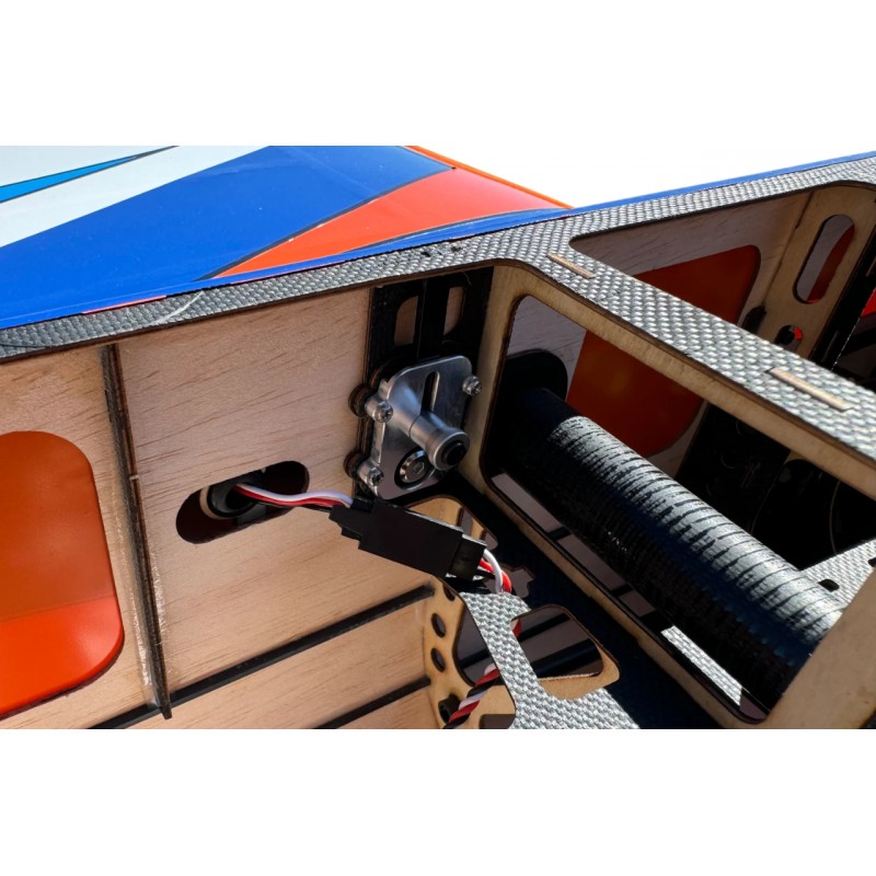 Les panneaux d'aile amovibles sont montés sur un tube d'aile en fibre de carbone, fixé au fuselage grâce à notre tout nouveau système de verrouillage rapide CNC. Le nouvel empennage auto-alignant permet une installation FACILE pour des performances optimales avec un minimum d'effort. Toutes les gouvernes sont actionnées par des tringles à commande manuelle avec des biellettes courtes et utilisent des rotules pour un fonctionnement précis et sans jeu. Des générateurs de force latérale à montage rapide (en option) sont inclus et augmentent la surface latérale déjà généreuse, améliorant ainsi l'autorité sur l'axe de lacet et la stabilité dans toutes les configurations de dérapage.