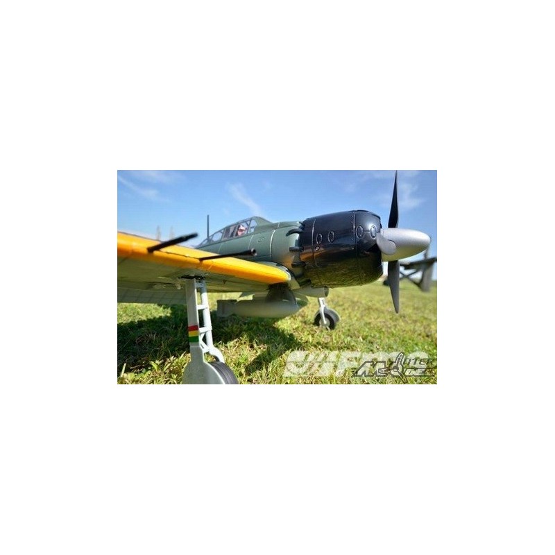 Les voilures renforcées permettent aux pilotes de réaliser des figures avancées comme les tonneaux à facettes, les barriques, les Immelmans, demi-huit cubain, le tout très facilement. Le train rentrant, les trappes de train, le réservoir largable, l'hélice tripale et son cône, et les volets d'intrados en plastique se conjuguent pour donner du réalisme à cet incroyable modèle. Cet avion a la puissance, des fonctionnalités complètes et une durabilité que les pilotes avisés vont adorer. Si vous aimes les chasseurs japonais, c'est le meilleur choix que vous puissiez faire ! Le Zéro de 1100 mm arrive sur le marché dès à présent.