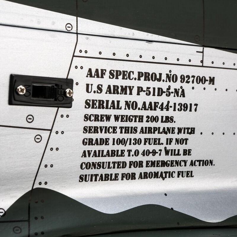 Un grand hayon supérieur offre un accès intérieur total, du cockpit au pare-feu. Le kit de visserie inclus simplifie l'assemblage au maximum et offre un montage aisé pour tous les moteurs et systèmes d'alimentation électrique recommandés. Quel que soit le groupe motopropulseur choisi, la maniabilité en vol est impressionnante, avec un look et une sensation de contrôle dignes de l'original. Que ce soit votre premier avion de guerre ou un complément idéal à votre collection, le modèle P-51D Mustang 20 cm³ Hangar 9 ARF est le modèle que vous recherchez.